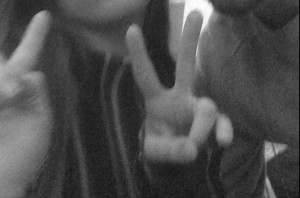 The artist makes work that spreads meaning across multiple medias and mediums in build-up objects and installations and inside single images themselves. For 2, we are introduced to the exhibition by an uncertain correspondence between the title and a blurry black and white image of two people with one of them making a peace sign to a camera as the exhibition image.