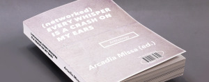“(ò_óˇ)” marks an appropriate end to the strain of excess that (networked) EVERY WHISPER IS A CRASH ON MY EARS embodies. Stamped on the empty last page of the anthology published by London’s Arcadia Missa and featuring contributions by 45 artists from around the (digitised) world, it tracks a six-month exhibition programme of the same name and a surplus of extra material. Press releases, installation photos, film stills, essays, artist interviews, prose, poetry, emails; these are scattered across 300+ pages of information that eschews a single-channel stream of content in favour of the more realistic overload of its stated ‘networked’ culture. Snubbing any conventional compulsion towards a straight narrative, the publication opts to map the web of collective thought from a creative cluster bound by book and fibre optics.