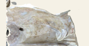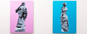 Graduating two years ago, Thompson’s digital practice is already mature, aiming at questioning classical dichotomies between an artwork and its copy, materiality and immateriality, subject and object. Blending 2D and 3D tools, the artist cultivates a piecemeal approach of infinite combinations and permutations of data. With ‘David1.tif’ and ‘Venus1.tif’, he recreates strikingly new original images from pre-existing and altered 3D-scan documentation of Michelangelo’s ‘David’ and the ‘Venus de Milo’, while providing a renewed aesthetic experience as a sort of meta-creation. As an abstract re-reading of an astonishing and monumental sculptural heritage the diptych delivers the original artworks of their function, developing its own intrinsic qualities stemming from the interplay of software and the set of options available to the artist.