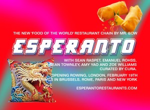 Pop-up restaurants proliferate in London these days, spurred on by the fomo-hyperbole of social media. Esperanto, a “multiethnic” global restaurant chain concept is the latest on the scene, according to its curators. Taking the simulacra of the rituals surrounding food as its theme, the show curated by CURA. Magazine at Rowing and running February 19 to March 19 has assumed the name of ‘Mr Bow’, a fictional character, as its head chef —to launch the first in a series of ‘food of the world’ eateries in the culinary-obsessed setting of London. With a Yelp page in addition to a sparse website, Esperanto walks a tricky line between appropriation and irony, emulating the cuisine and look of a traditional Chinese restaurant, but one transplanted from the future by way of a reliquary to a stage-set from a Quentin Tarantino film. With a new work by Sean Raspet at its core, the ‘restaurant’ is made up of pieces by Emanuel Röhss, Sean Townley, Zoe Williams and Amy Yao.