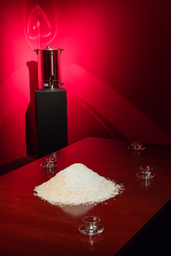 All this serves to play backdrop to Raspet’s ‘Maillard Process Simulation 0.1% in Water’. A bog-standard metal tea urn sits incongruously in the opposite corner, spotlit, the reflections throwing shapes onto the cherry-red walls. The work (technically what is inside the urn) is the only thing on the menu at Mr Bow’s dinner table —a bewilderingly long list of unpronounceable chemicals to whet your appetite —and you can try it. I hope that someone finds the restaurant’s profile on Yelp and decides to pay it a visit to impress their date. I wish I could be there as they mistake the invigilator for a Maitre’d, and, raising the morsel of clear liquid to the light, swirling it around as though trying to imitate a sommelier, sniffing it, a subtle sweet-yet smoky smell fills their nostrils. It smells like —Peking duck! Tentatively putting the cup to their lips an umami duck-ness comes through, which surprises by its power in contrast to the unassuming clear liquid that delivered its flavour. “Raspet’s Maillard Process Simulation is delicious” one will confer to the other, before hedonistically sticking their forefinger deep into Yao’s rice mound, they just couldn’t help themselves.