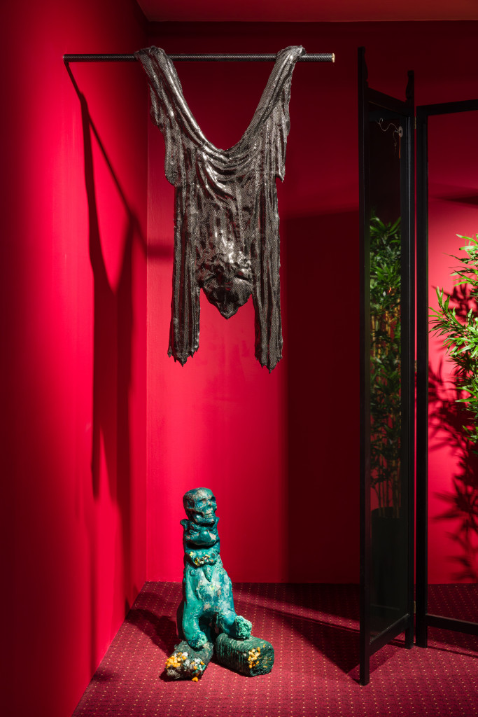 Emanuel Röhss’s gargoyles ‘Hunger’and ‘Thirst’ squatly sit either side of the screen, the ‘studio debris’ that they’re made from poking out of the blue-green patina —Wotsits and dirt escaping from their admixture like worms out of a compost bin. Towering over them are Sean Townley’s ‘CF/SG/NM’; carbon-fibre and epoxy bear and pig-pelts hanging from ornately swirled flag poles, completing the strange symmetry of the curation. They’re reminiscent of the kind of heraldry you might get in a medieval banqueting hall —lending grandeur to the proceedings —but instead of family crests they pay homage to the animal’s flesh, luridly mimicking the fabric of a cheaply-made ‘disco diva’ outfit that you’d find bopping around the light-up tiled dance floor of a 70s tribute nightclub. That is to say, the theme of simulacra doesn’t skip a beat here: imitation is the name of the game.