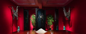 The gallery is presented as an intimate restaurant. Its walls are painted an enthusiastic Naphthol red – a flat, ripe-cherry hue usually used for spraying automobiles – and the floor is newly carpeted in the kind of patterned burgundy that you might find in a middlebrow hotel lobby. A tableaux of works are lined up in front of the far wall and a long, low, lacquered table in the middle of the room is sparsely set with glass espresso cups and saucers. A white mound of rice is piled threateningly in the middle of the table. So tidily arranged is everything, so symmetrical, that the words feng shui can’t help but come to mind.
