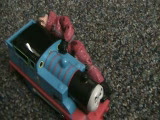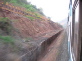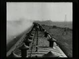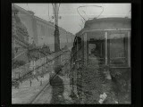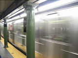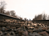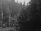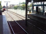 shot from ground level shows track as train approaches then under the train as train speeds into station and stops