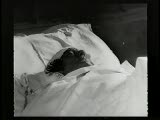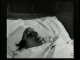 funeral procession with open casket focus on head of dead man surrounded by flowers