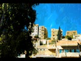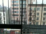 splitscreen of high rise buildings slanting; with cameraman superimposed on left