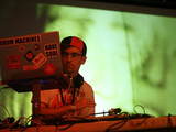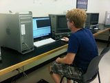 medium shot manwmc filming with camera on; tripod, turns towards camera