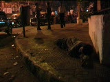 derelict sleeping near hedge, people passing
