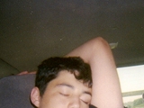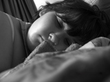 same woman sleeping, arm over head; same patterned blanket