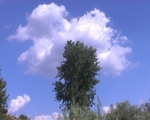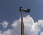 3 lamp posts. Clouds in sky