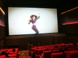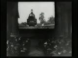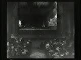 people in theater watching a train headed toward the screen
