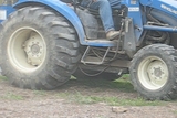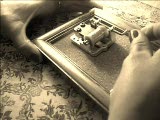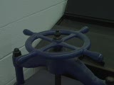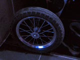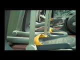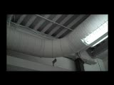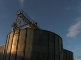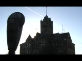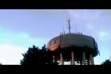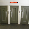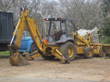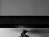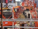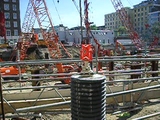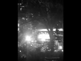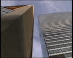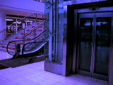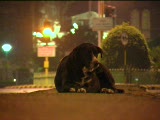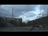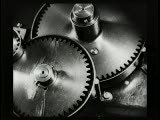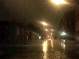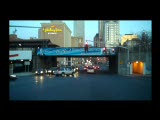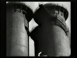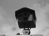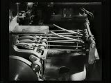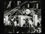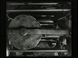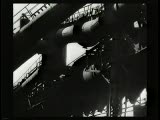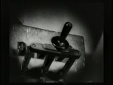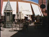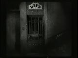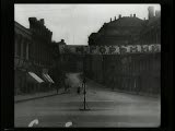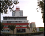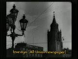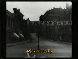 street with shops,1 person walking; street sweeper (banner advertises anniversary edition of Gorky works)