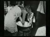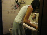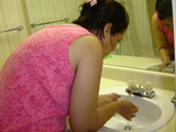 woman dressing washes face in basin