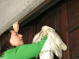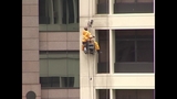 woman washing window from outside