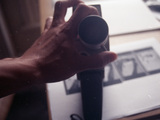 close up crank on camera, hand of manwmc; begins cranking