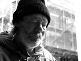 derelict on steps rubbing eyes