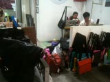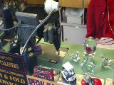 sewing machine in shop window with seated; mannequin, trees blowing reflected in glass
