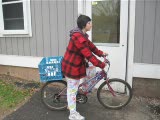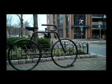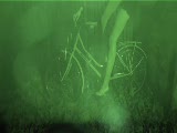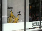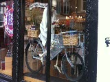 window of bicycle shop, female mannequin; on bike, someone moving inside shop