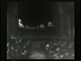 people in theater watching a train headed toward the screen