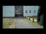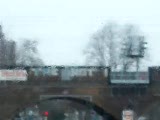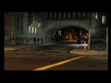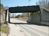 car with manwmc drives under bridge and; out of view. He stands to film while car rolls