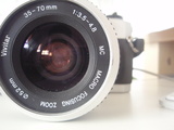 close up camera lens with reflection of; cameraman