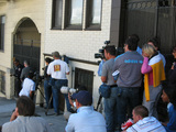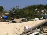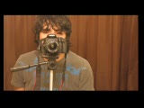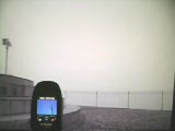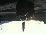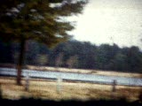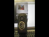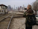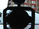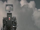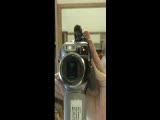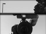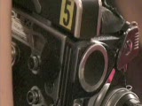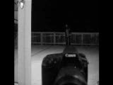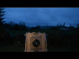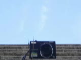 Introduction to the camera and Man With A Movie Camera (ManWMC) via split screen and sped up footage Bottom half, camera facing camera that's recording, top half manwmc climbs onto a mound from behind, sets up tripod to begin filming