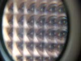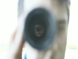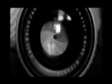 closeup, camera lens with big eye filling it +; man wmc carrying tripod as reflection