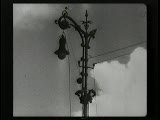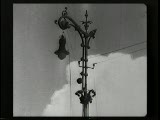 clouds moving fast behind lamppost; The Theatre: scene includes entrance, the curtain, animated shots of seats, crowd filling the seats, individual and group shots of musicians in the orchestra and conductor, the projectionist at work