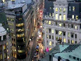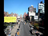 aerial long view of street with trees; people crossing