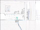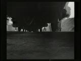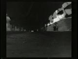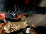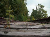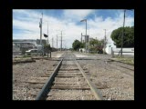 shot from ground level shows track as train approaches then under the train as train speeds into station and stops