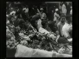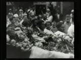 funeral procession with open casket focus on head of dead man surrounded by flowers