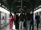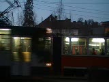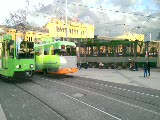 trolleys going in opposite directions, none in background crossing tracks, people walk across tracks after trolleys pass