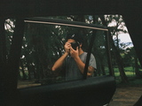 medium shot manwmc filming with camera on; tripod, turns towards camera