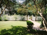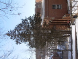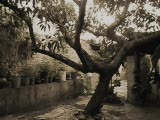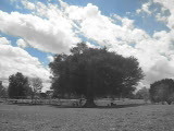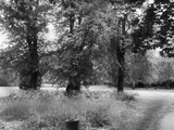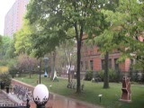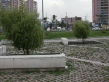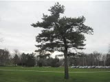 trees blowing in breeze at park w; empty picnic tables-