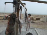 people washing off under shower-long shot