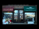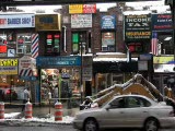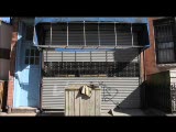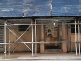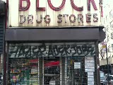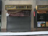 store front,grates closed,sign wine vodka; and food store